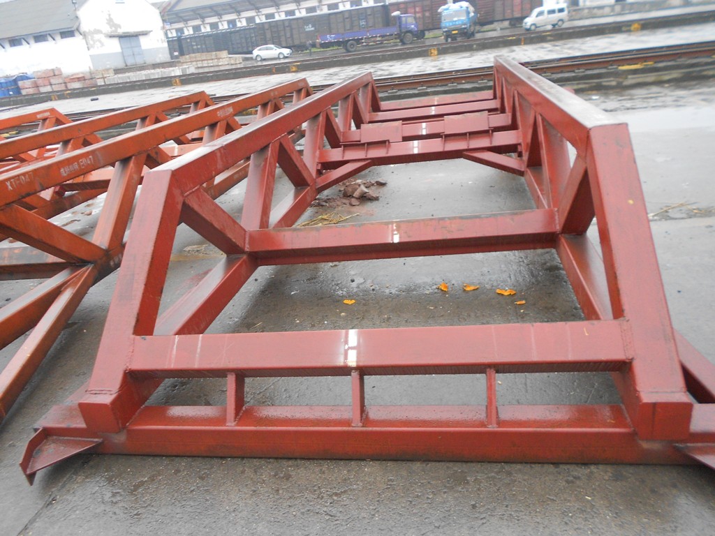 為了滿足國家提出的可持續發展要求,并根據各鋼廠實際運輸要求,我公司于2011年開發研制了一種可循環重復使用的卷鋼運載載具(以下簡稱卷鋼集裝托架)。可替代原凹形草墊臥裝方式,在實際使用過程中,大幅度降低卷鋼運輸成本,節約資源,達到可持續發展目標。并可根據鋼廠實際運營情況,提供循環回送服務。